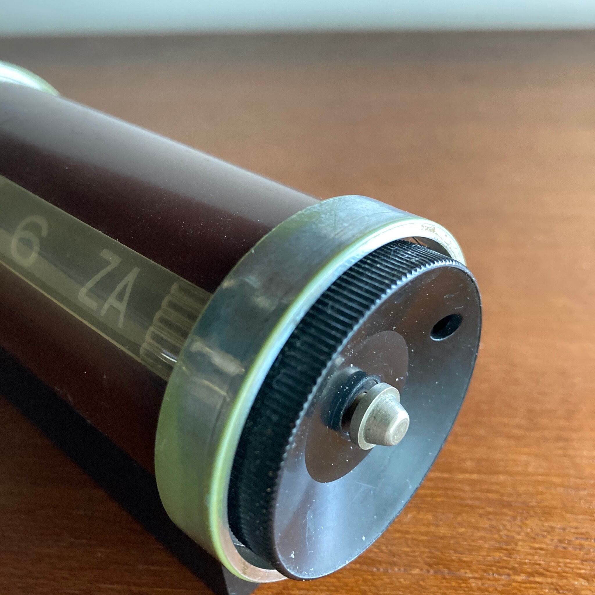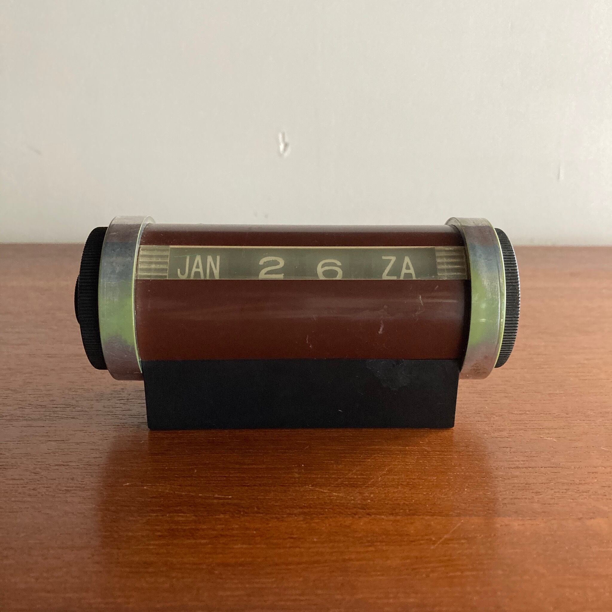左右のダイアルを回すと月日、曜日が変えられるアナログカレンダー。